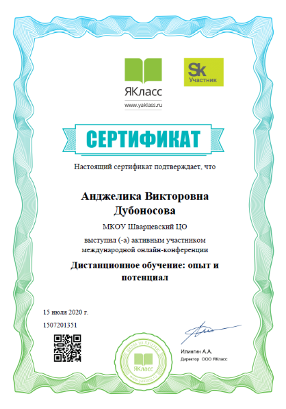 Июль, 2020г. АКтивный участник международной онлайн-конференции "Дистанционное обучение: опыт и потенциал"