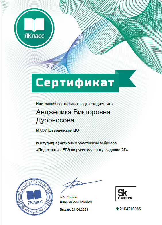 Апрель, 2021г. Активный участник вебинара "Подготовка к ЕГЭ по русскому языку: задание 27"