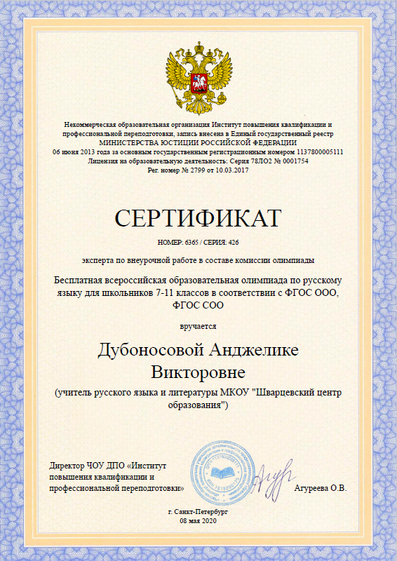 Май, 2020 г. Сертификат эксперта по внеурочной работе в составе комиссии бесплатной всероссийской образовательной олимпиады по русскому языку для школьников 7-11 классов в соответствии ФГОС ООО, ФГОС СОО.