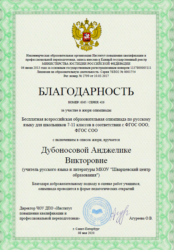 Май, 2020 г. Благодарность за участие в жюри всероссийской образовательной олимпиады по русскому языку для школьников 7-11 классов в соответствии ФГОС ООО, ФГОС СОО.